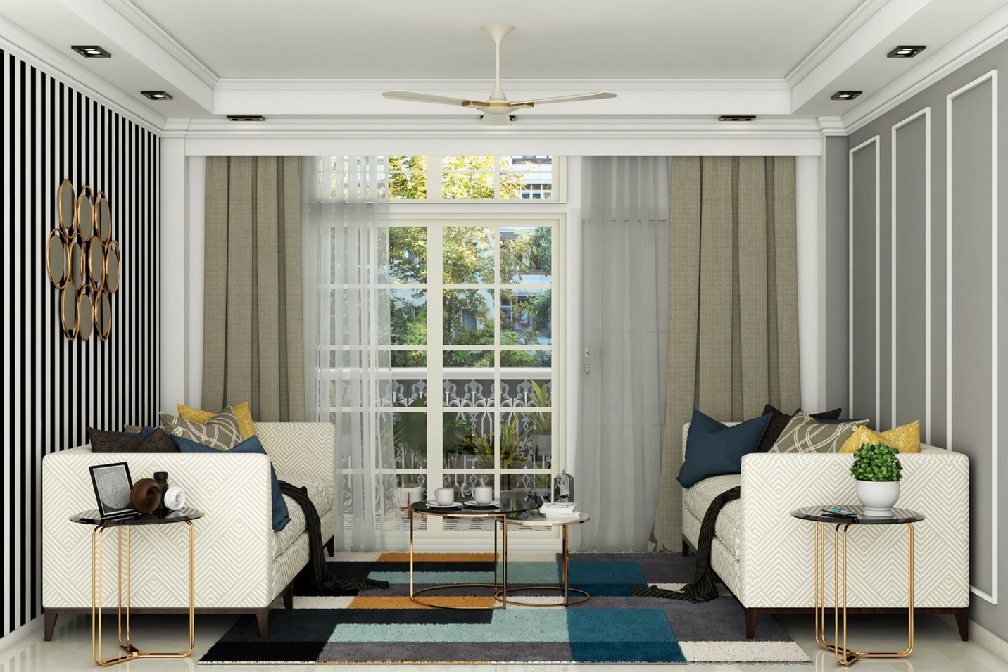 If you fancy a living room with a distinctly European vibe, you will fall in love with this spacious living room with an upholstered cream sofa. The walls, accentuated in black and white stripes and grey paint with trims on both sides of the sofa, underline the contemporary design style. A coffee table and side table with golden metallic legs and a black glass table top add panache to the room.