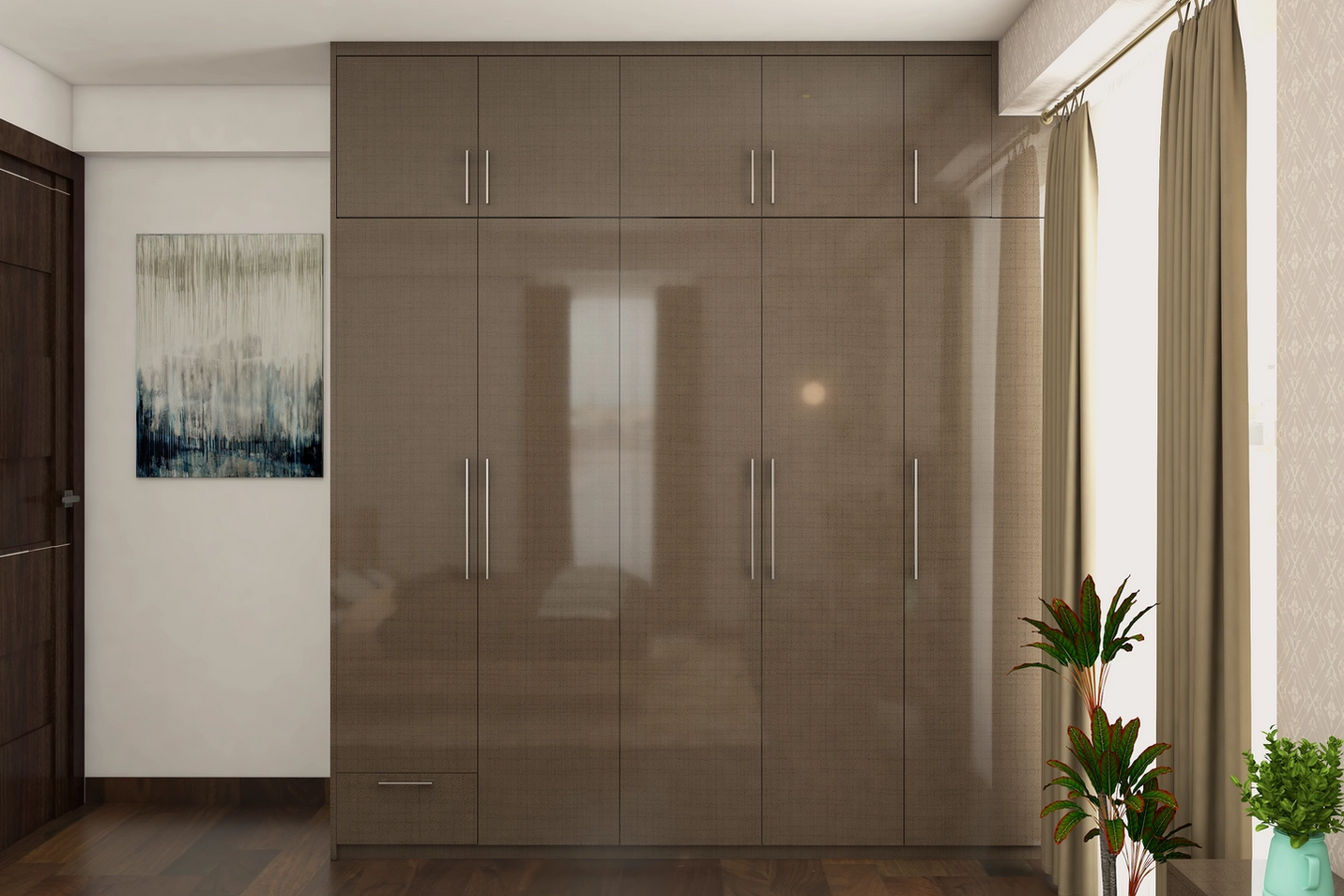 The brown glossy wardrobe reflects the space around it and gives a seamless look. The swing shutter design with lofts accommodates ample storage space. Long, sleek stainless steel handles make it easy to pull the doors and make them durable.